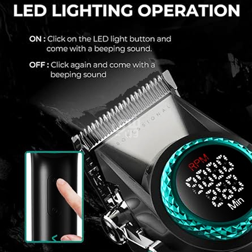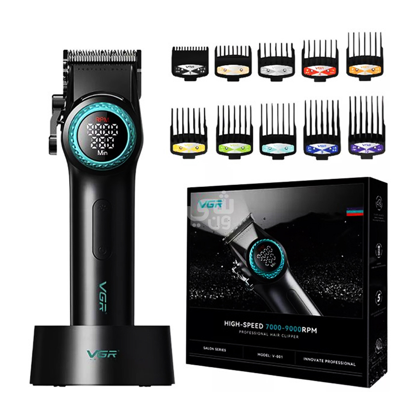 ماكينة حلاقة احترافية من سلسلة BARBER V-001، تتميز بمحرك عالي السرعة 7000-9000 دورة في الدقيقة وتقنية مبتكرة.