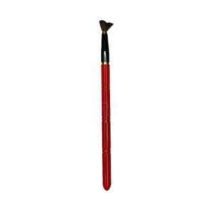 فرشاة مكياج ذات شعيرات ناعمة على شكل مروحة ومقبض أحمر، مثالية لإزالة الفائض من البودرة أو الهايلايتر، أو لتطبيق الماسكات.
